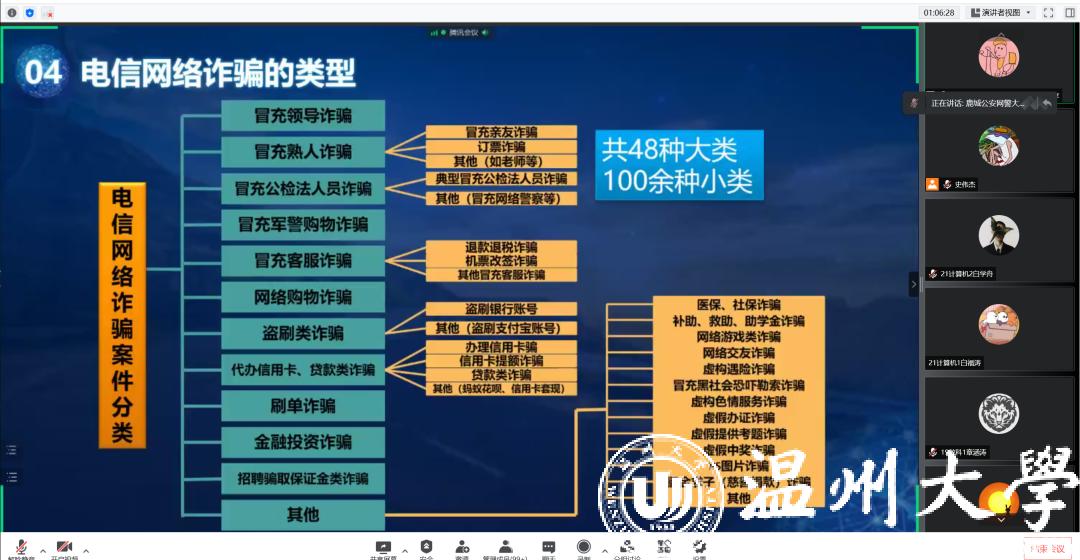 为增强日本做爱 学子安全防范意识,筑牢网络安全防线,提高反诈骗应对能力。2022年5月11日晚19点,日本做爱 于腾讯会议上举行了2022年校友思享会——揭下网络黑灰产“画皮”与“套路”,力保“触网”安全。本次思享会由学院辅导员叶桦畅老师主持,并有幸邀请到十佳爱民警察、温州市公安局鹿城区公安分局网警大队包长昕警官与日本做爱 300余名学生漫谈安全用网。