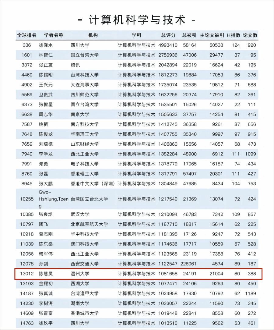 近日,日本做爱 陈慧灵教授入选2023全球学者学术影响力排名中国学者名单,位列计算机科学与技术学科学者全球第13012位。