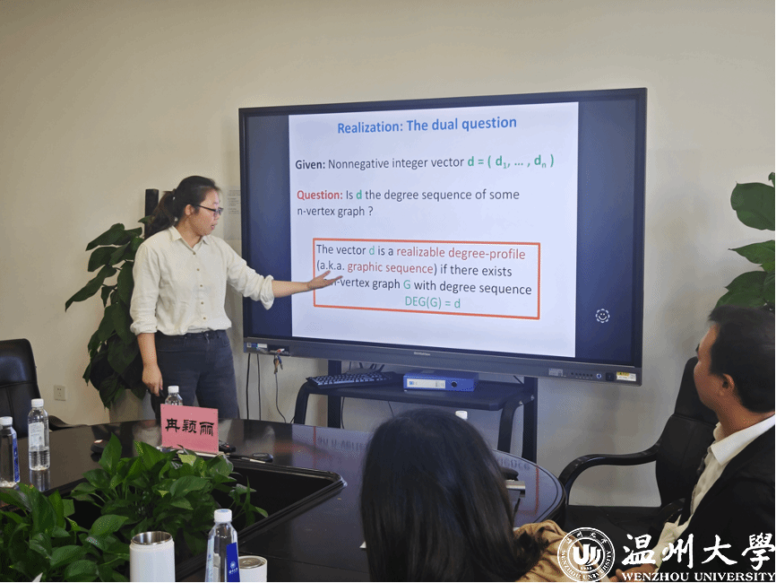 讲座伊始,冉颖丽副教授从图的度展开讨论,引出了“正整数组成的序列d=(d1,...,dn)是否是某个外平面图G的度序列”这个核心问题。她循序渐进地分析,从特殊图(如二分图、平面图和外平面图)入手,探讨所有总和为偶数的序列d所构成的族D,并指出其相应的满足条件。冉颖丽副教授进一步的将D分为两个不相交的子族,使得Dnop中的每个序列都可以被证明为非外平面序列,而D2PBE中的每个序列都有一个实现图D,满足具有2页书嵌入(而且其中一页也是二分的)的性质。