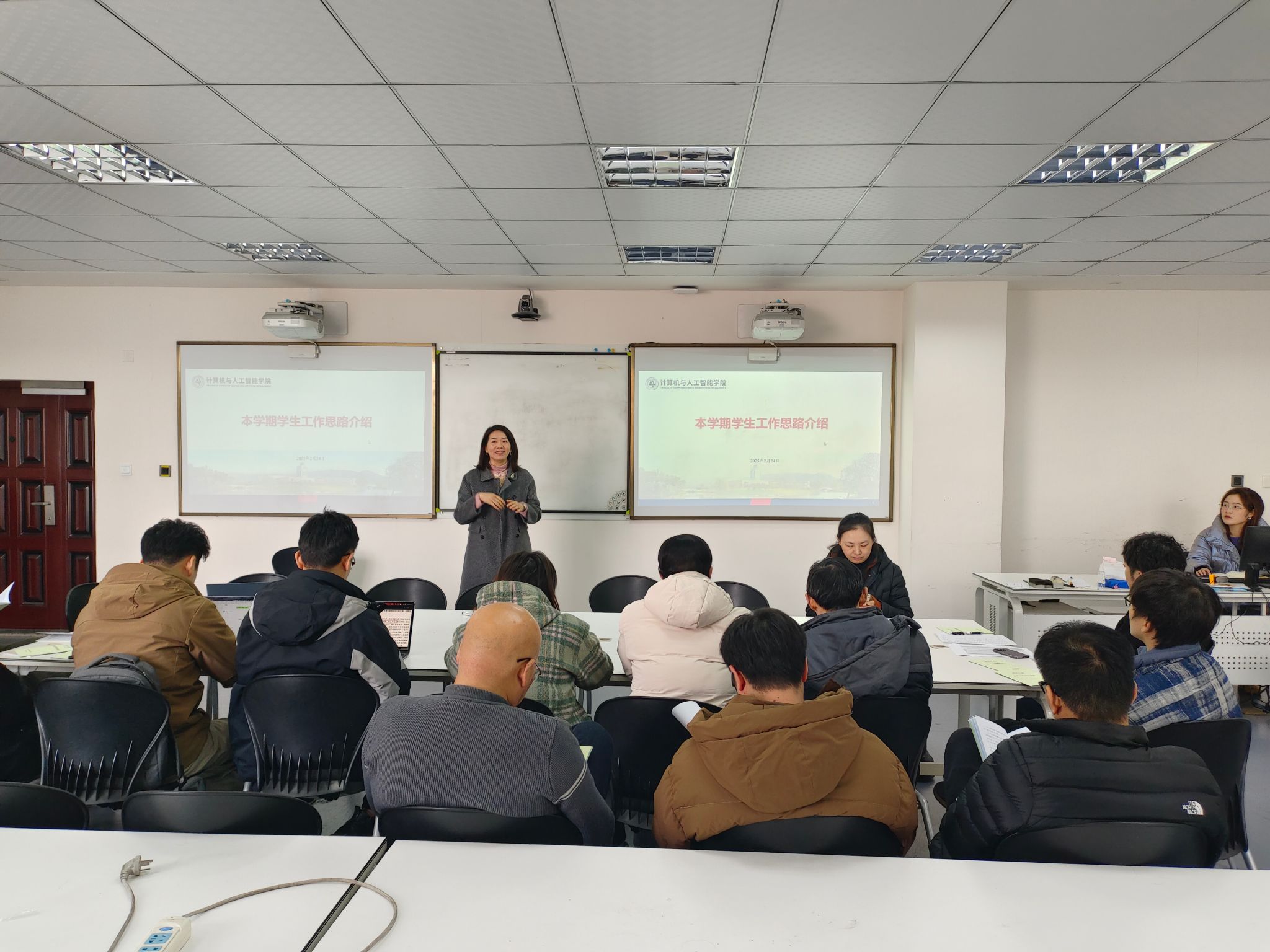 学院党委副书记、纪委书记彭小媚介绍本学期学生工作思路。彭书记指出,本学期学院将以推进学生工作“精准化、精细化、精练化”为目标,持续拓展“AI 创世界品牌”活动,创新AI品牌,激发学生对前沿科技的兴趣与实践能力。同时,重点聚焦考研升学工作,通过政策宣传、经验分享、课程辅导及心理疏导等,助力学生备考。在三全育人方面,推行学院领导、寝室导师、辅导员下寝室主题活动,实现寝室走访全覆盖,以寝室为主体加强管理,开展寝室评比,完善制度,营造良好寝室文化,实现学生全方位管理,并将全院教工纳入寝室导师队伍,进行育人工作量化考核。此外,彭书记重点指出,各位班主任要明确党内宗教信仰政策,及时关注和掌握学生意识形态,掌握学生宗教信仰情况,守牢校园思想防线,引导学生成长为德智体美劳全面发展的社会主义合格建设者和可靠接班人。