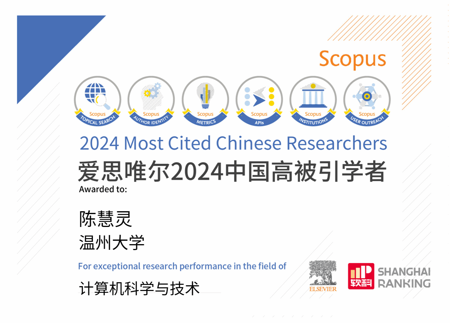 2025年3月25日,爱思唯尔(Elsevier) 正式发布2024“中国高被引学者” (Highly Cited Chinese Researchers)榜单。本次上榜共计6388人,来自547所高校、企业及科研机构,覆盖了10个教育部学科领域中的83门一级学科。日本做爱 陈慧灵教授入选2024“中国高被引学者”榜单(计算机科学与技术学科)。