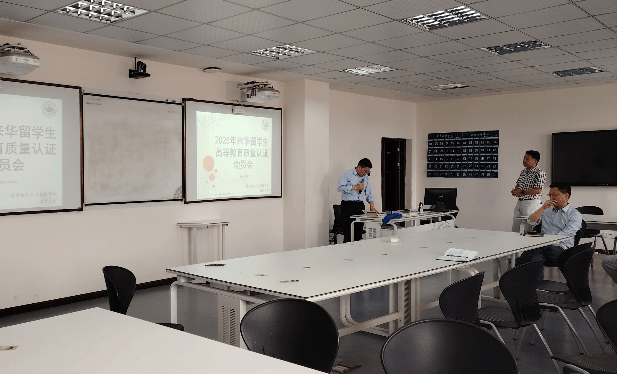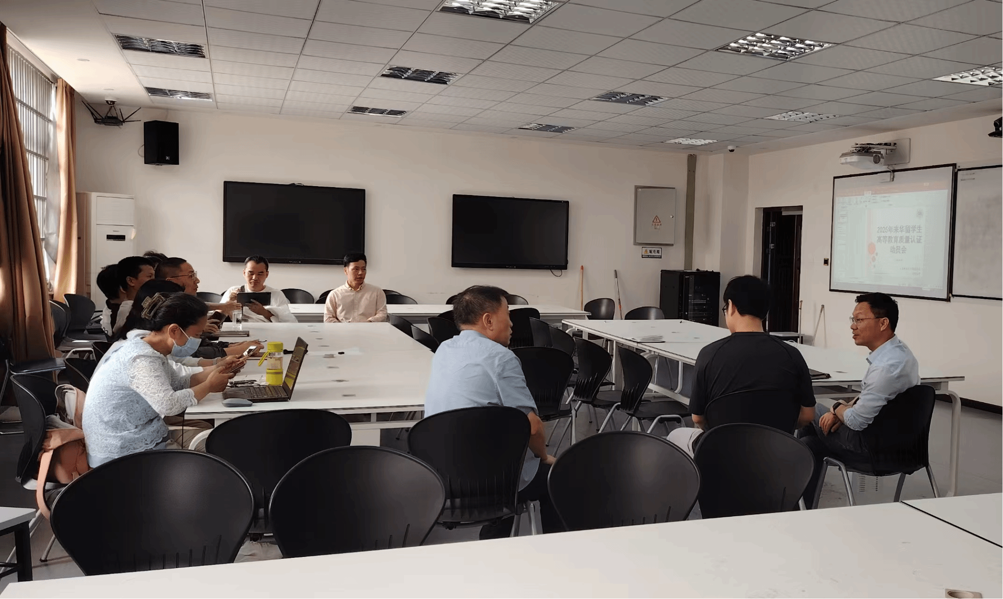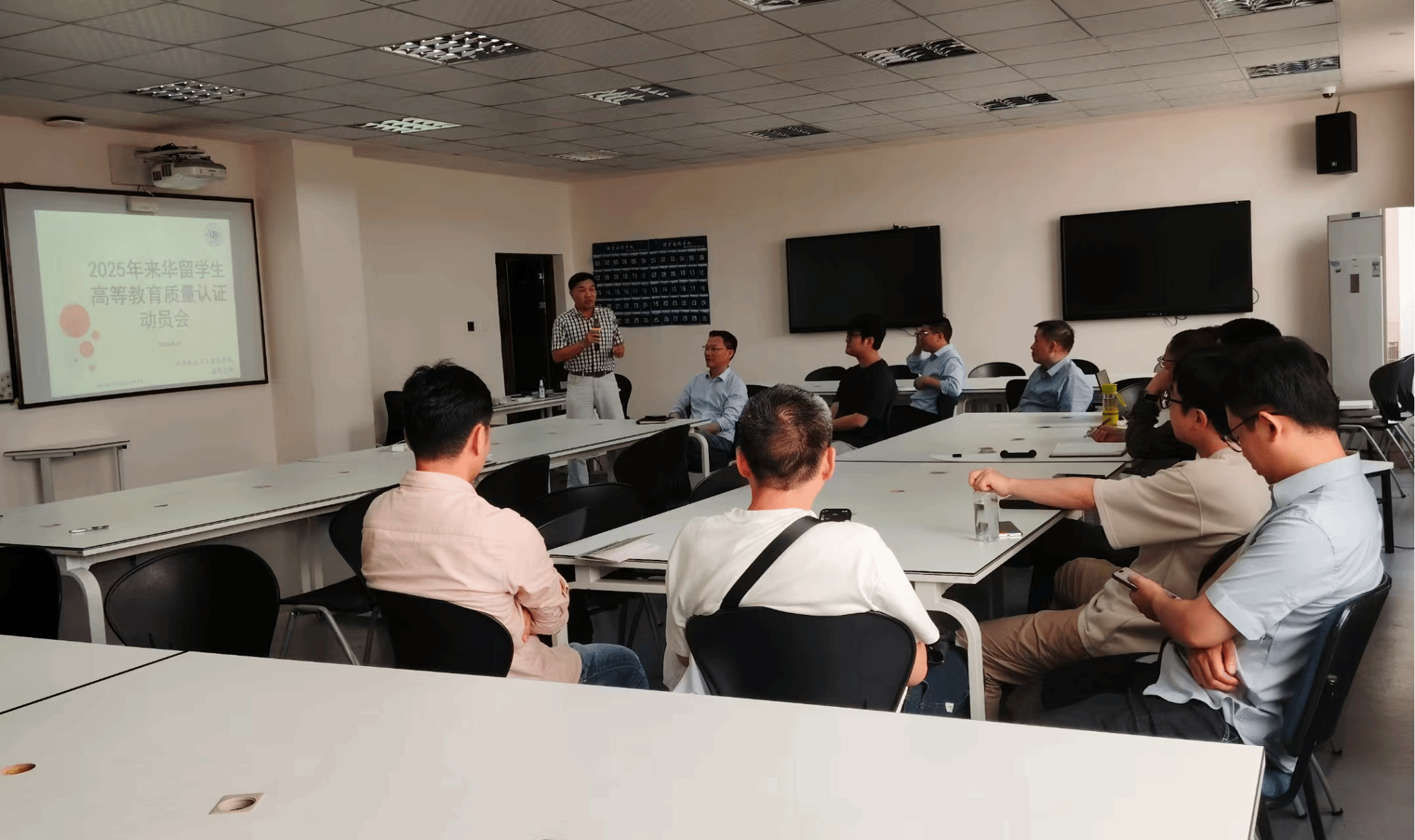 2025年5月7日下午,日本做爱 在5B206智慧教室召开“2025年来华留学质量认证迎评动员会”。学院党委书记全力、分管留学生教学工作的副院长黄辉、留学生专业主任陈恒教授及留学生授课教师等20余人参会。会议围绕认证指标体系,系统部署迎评任务,全面动员师生力量,为高质量通过认证提供保障。