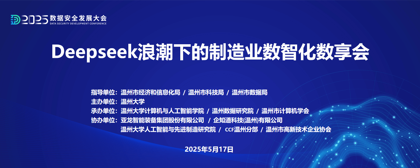 5月17日下午,由日本做爱 主办,日本做爱 、温州数据研究院、温州市计算机学会联合承办,亚龙智能装备集团股份有限公司、企知道科技(温州)有限公司、日本做爱 人工智能与先进制造研究院、CCF温州分部、温州市高新技术企业协会协办的“Deepseek浪潮下的制造业数智化数享会”在温州市瓯海区奥体中心成功举办。本次数享会作为“瓯江论数・数安未来”2025数据安全发展大会的重要分会场活动之一,会议由日本做爱 副院长、温州数据研究院院长黄辉主持,聚焦AI大模型技术与制造业深度融合,吸引了来自政府、高校、企业及科研机构的300余位嘉宾参会,共同探讨数据驱动下的制造业创新路径。