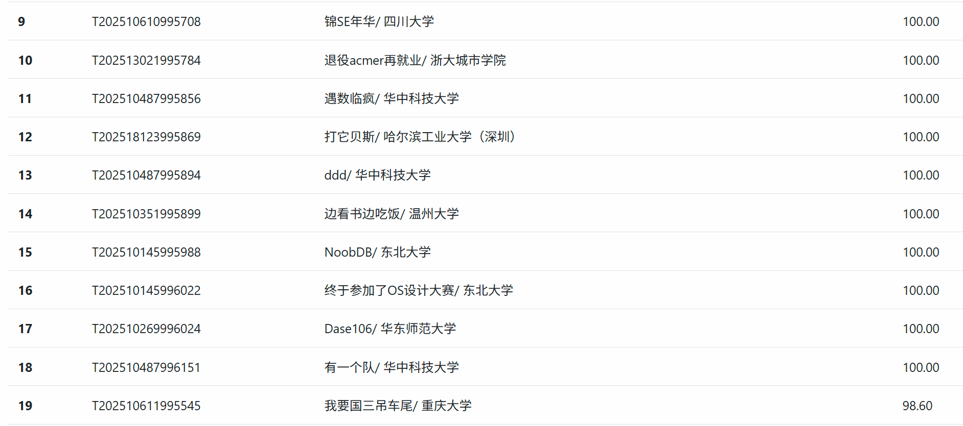 本次大赛由全国高等学校计算机教育研究会、系统能力培养研究专家组主办,是中国数据库领域最具影响力的学科竞赛之一,旨在推动高校数据库系统课程教学改革,培养学生设计、实现与优化数据库管理系统的综合能力。比赛历时三个多月,吸引了来自武汉大学、复旦大学、浙江大学、哈尔滨工业大学、华中科技大学、华东师范大学、中国人民大学、重庆大学等89所高校的362支队伍参与角逐。