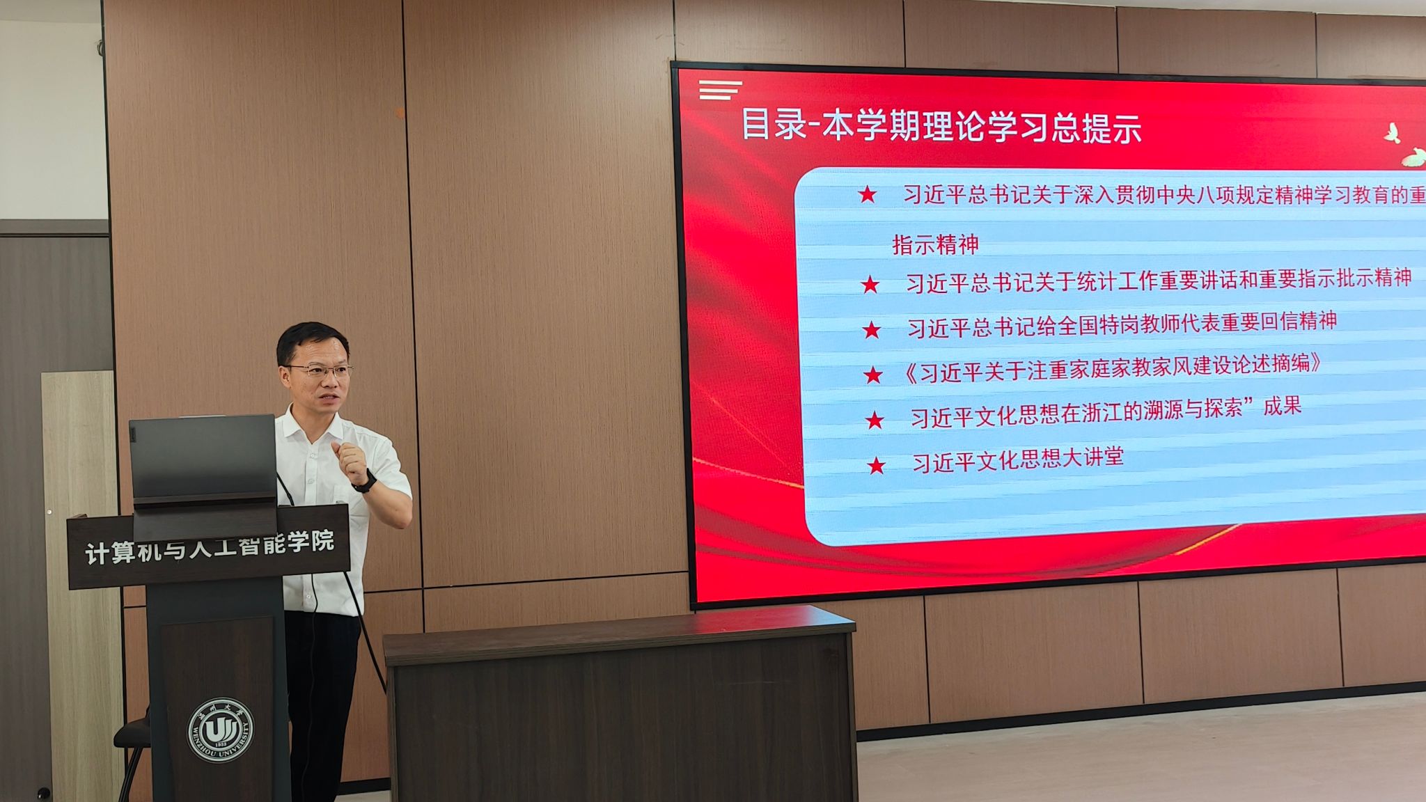 党委书记全力围绕本学期教师理论学习开展专题宣讲并给出提示。全力书记指出,本学期需重点学习习近平总书记关于中央八项规定、统计工作、特岗教师代表重要回信的指示精神,以及《习近平关于注重家庭家教家风建设论述摘编》、习近平文化思想在浙江的溯源与探索成果、习近平文化思想大讲堂等内容。他解读道,八项规定核心是改进工作作风、密切联系群众,需警惕“四风”问题隐形变异;统计工作要确保数据真实,服务高质量发展;特岗教师精神值得弘扬,要鼓励吸引人才投身乡村教育;家庭是社会基本细胞,领导干部要带头正家风;浙江在习近平同志指导下,以“八八战略”推动文化建设,为文化繁荣奠基,需引导教职工将思想行动统一到上级部署中来。