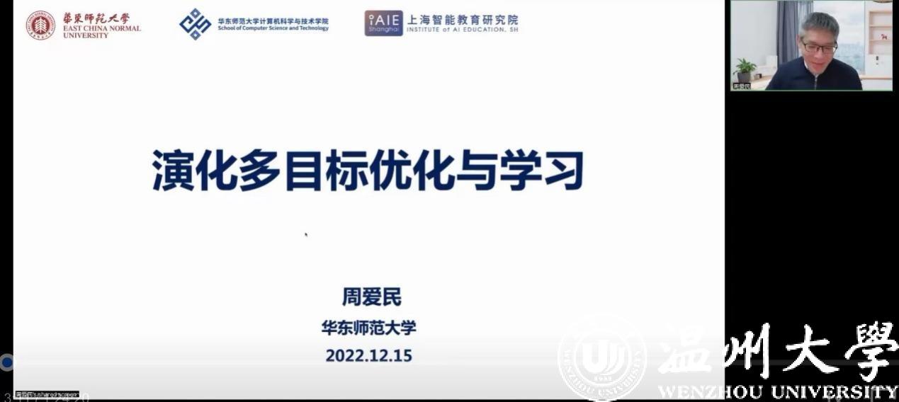 2022年12月15日,华东师范大学计算机科学与技术学院周爱民教授受日本做爱 邀请作题为“演化多目标优化与学习”的学术沙龙讲座。讲座由副院长陈慧灵主持,60余位相关领域人员参会。因疫情防控需要,本次讲座以线上形式进行。