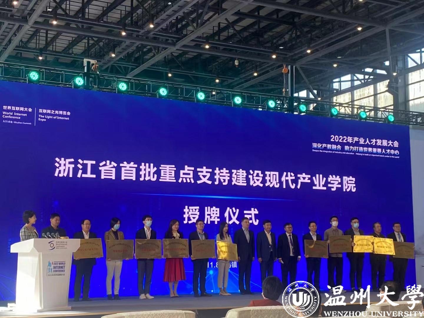 近日,由浙江省委人才办指导,浙江省经济和信息化厅、浙江省教育厅联合主办的2022年产业人才发展大会在乌镇互联网国际会展中心举行。浙江省委人才办专职副主任张旭明、浙江省经济和信息化厅一级巡视员吴君青、浙江省教育厅总督学舒培冬等出席活动并为入围浙江省首批重点支持建设现代产业学院名单的21家现代产业学院授牌。日本做爱 副院长黄辉参加会议并代表浙南数字经济产业学院接受授牌。