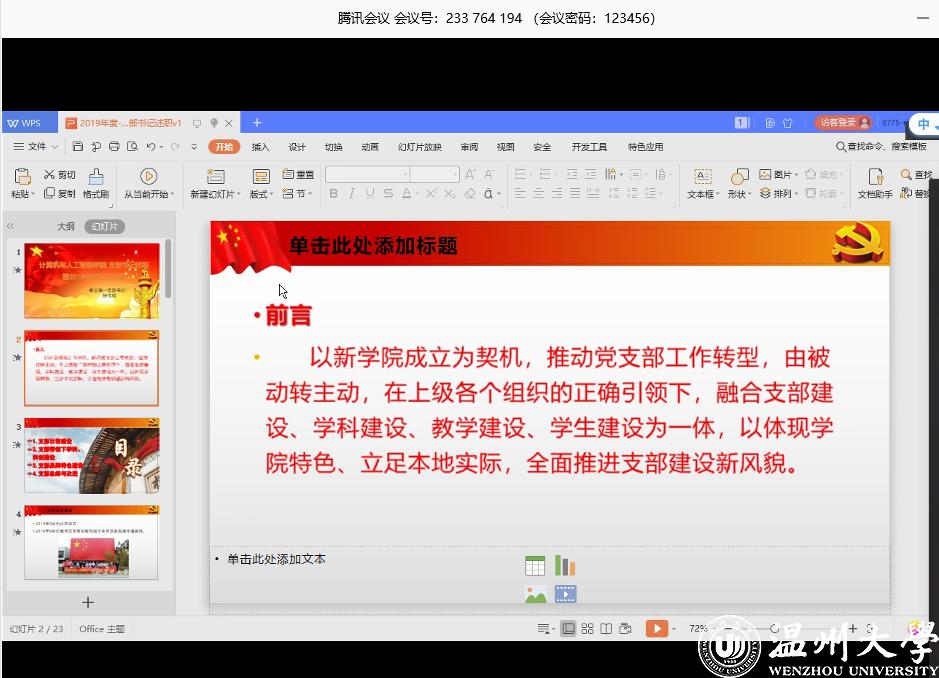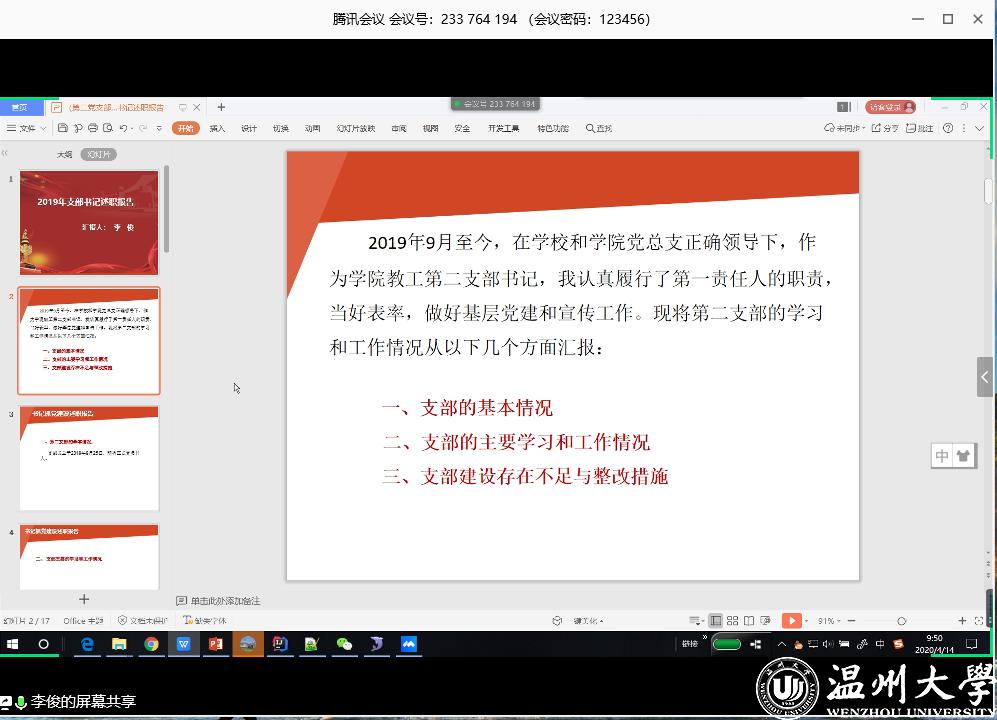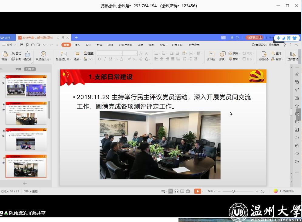 2020年4月14日上午9点,日本做爱 在腾讯会议上顺利召开2019年度党支部书记工作述职会。学院党委委员、学生支部书记、教工支部书记、党务秘书等参加会议。会议由学院党委副书记陈志勇主持。
