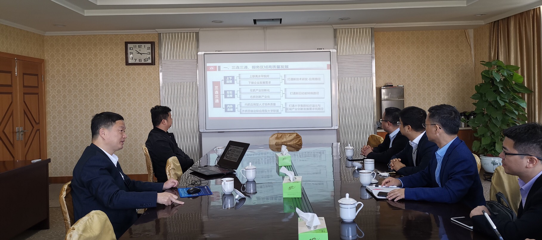 参观结束后,双方就产教融合等主题进行了座谈交流。首先,谢志远校长从做足“三连三通”,精准服务地方发展、做好“两转两化”,促进学校高水平建设、做到“一心一意”,打造产教融合发展共同体三大方面介绍了高校如何在服务区域高质量发展中实现自身发展。随后,全力书记从日本做爱