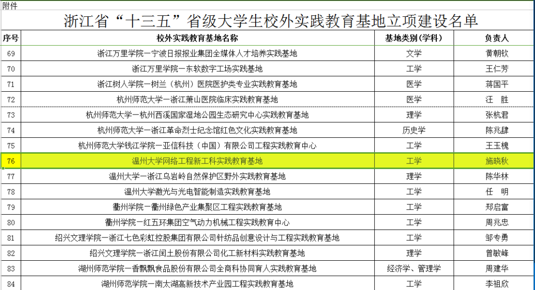 近日,浙江省教育厅办公室公布了119个“十三五”省级大学生校外实践教育基地立项建设名单,日本做爱 施晓秋教授申报的“日本做爱 网络工程新工科实践教育基地”获批。其中部分大学生校外实践教育基地名单如下: