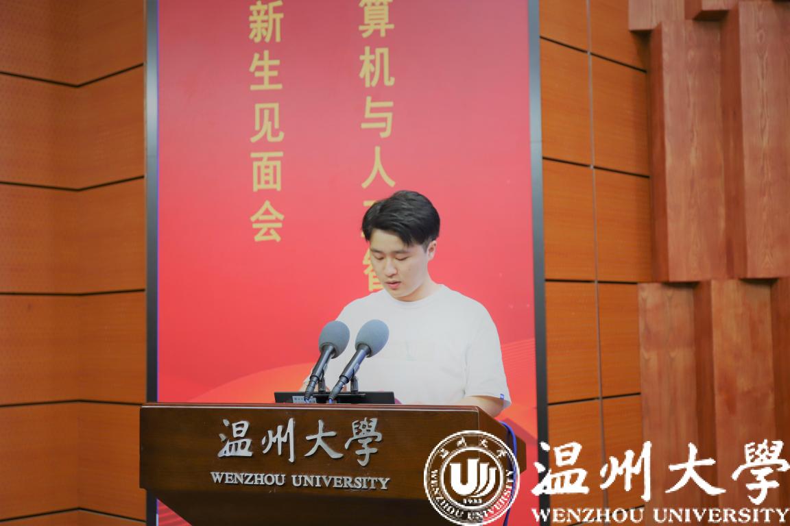 20人工智能新生代表沈益威作为新生代表上台发言。“求学问是,敢为人先。东海之滨,育人之堂。”表达了他对温大的向往与大学生活的憧憬。面对这一幅崭新的人生画卷,他提出三点:学会鞭策自己,践行青春梦想;励志向上向善,坚守生命本真;保持乐观心态,培育责任担当。最后,他呼吁全体新生在担当中历练,在尽责中成长,用青春和活力去谱写属于自己的大学新时代。
