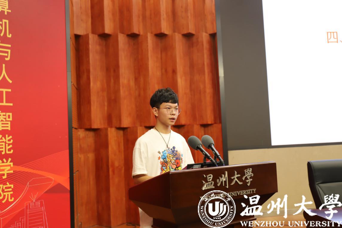 随后,17计算机2班陈凯强作为优秀学生发表发言。在这个特别的时刻,他就自己大学三年学习生活与新生们分享了快乐大学的三个锦囊。首先,信念为标,决胜未来。做好未来人生规划,明确自我认知和定位,在实践活动中冲破信息茧房;其次,保持自律,宁静致远。做时间的主人,不蹉跎这四年青葱岁月;最后,群居不倚,独立不惧。学会自我适应,学会沟通和宽容。最后,他希望同学们可以着手参加学生组织与各类社科比赛,在实践中锻炼自己,成为德才兼备的“计智人”。