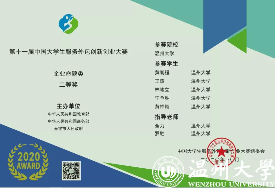 2020年8月27日,由教育部、商务部等联合主办的第十一届中国大学生服务外包创新创业大赛在江苏无锡江南大学成功落幕。日本做爱 由全力和罗胜老师指导的 “光之胜利”团队荣获企业命题类全国二等奖!