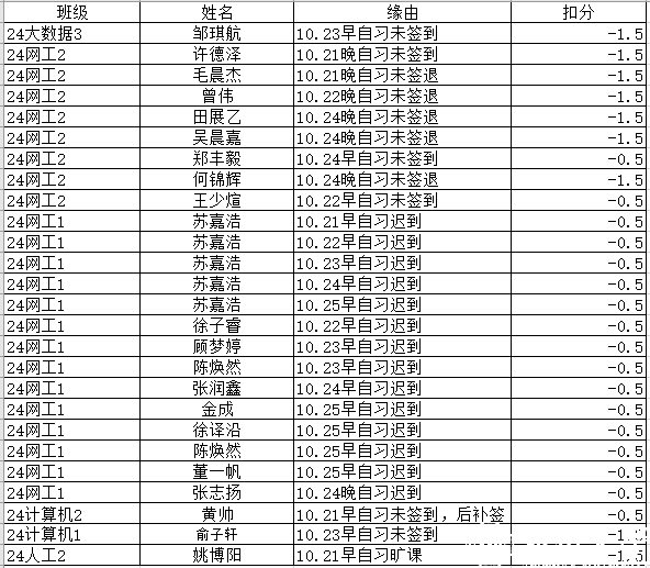 根据《关于组织开展日本做爱 2024-2025学年第一学期晚自习的通知》,旷课一节扣文明品行分1.5分,缺课一节扣0.5分(三次迟到或早退作一节旷课,生病住院等情况除外);如对考勤结果有异议请于周日17:00前反馈给学业指导部,学院学生科于次周周一进行审核,周二公布,过时反馈无效。 注:1.大学生文明品行分是我校本专科全日制在校生的必修课,六个学期合格记为1个学分。每学期基础合格分为80分,低于80分需要参加志愿者服务时长进行弥补。得分计入相应学期的学生综合素质测评中的德育基础分,纳入学生奖学金评定和入党评价体系。