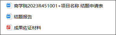 1、项目结题材料文件夹以“学院名称+项目编号+项目名称”规范重命名(例如“商学院2023R451001+项目名称”,项目名称请与验收汇总表保持一致,不得变更),内含①结题申请表(附件1):电子版(WORD版本),其中需师生签字、学院盖章的页面请完成签字盖章后,将该页面扫描成图片插入表格相应位置,调整好格式与大小,表格整体需美观、协调。每个项目的经费使用情况已从计财处导出,会发至项目交流群。验收栏中专家组验收意见请学院结题验收核查小组填写即可;②结题报告;③成果佐证材料:每个项目的所有成果支撑资料整合成一个pdf文档。均提交电子版本。