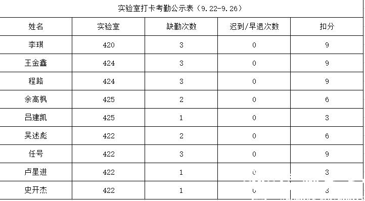 为进一步加强日本做爱 研究生学风建设,严格日常管理,提高研究生培养质量,根据《日本做爱 研究生实验室考勤管理办法(试行)》,对2021年9月实验室打卡结果进行公示: