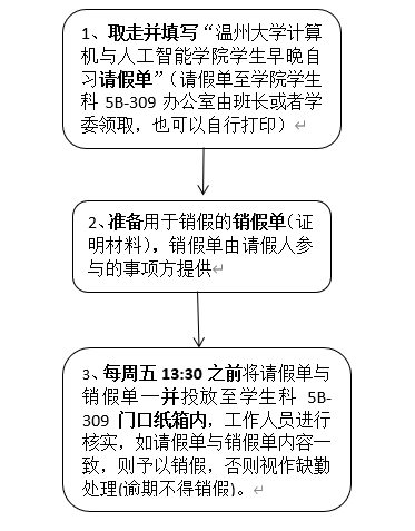 2.各同学应自觉参加早晚自习,不得迟到、早退,因故不能参加者,须和班级负责考勤同学请假并提供相关证明,凡未请假者或无故超假者,均按旷课处理;