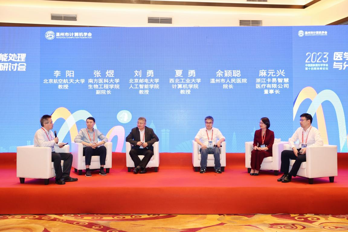 论坛圆桌讨论环节,围绕“大模型时代的医学影像AI研究:机遇与挑战”主题开展相关讨论,由北京航空航天大学李阳教授主持。报告嘉宾夏勇教授、刘勇教授和南方医科大学生物医学工程学院副院长张煜、温州市人民医院院长余颖聪、浙江卡易智慧医疗有限公司董事长麻元兴五位专家学者围绕相关问题发表观点,进行热烈的讨论。