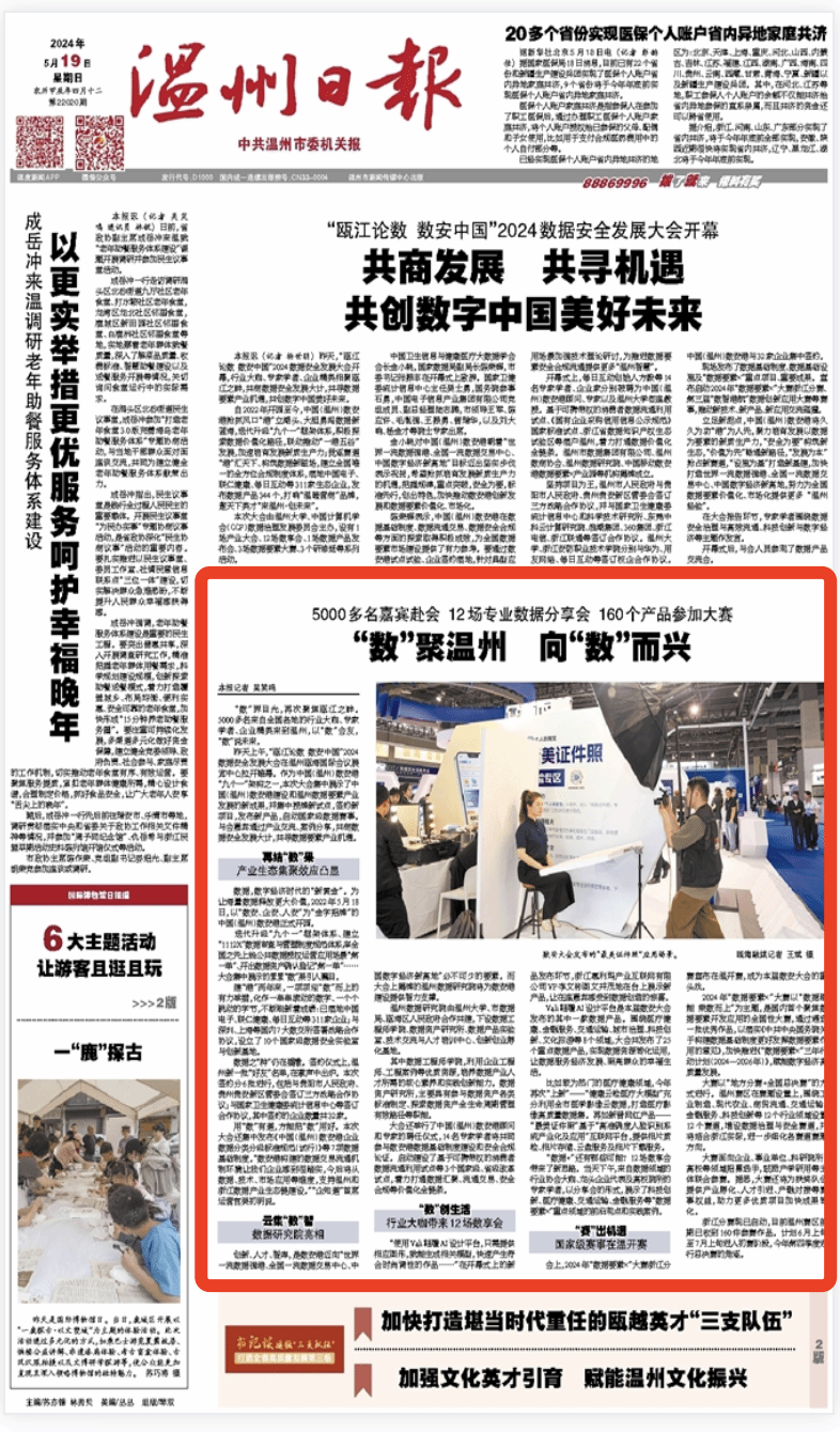 用“数”有道,方能把“数”用好。本次大会还集中发布《中国(温州)数安港企业数据分类分级标准规范(试行)》等7项数据基础制度。“数安港构建的数据交易流通机制环境让我们企业感到很踏实,今后将从数据、技术、市场应用等维度,支持温州和浙江数据产业生态链建设。”“企知道”首席运营官吴初明说。