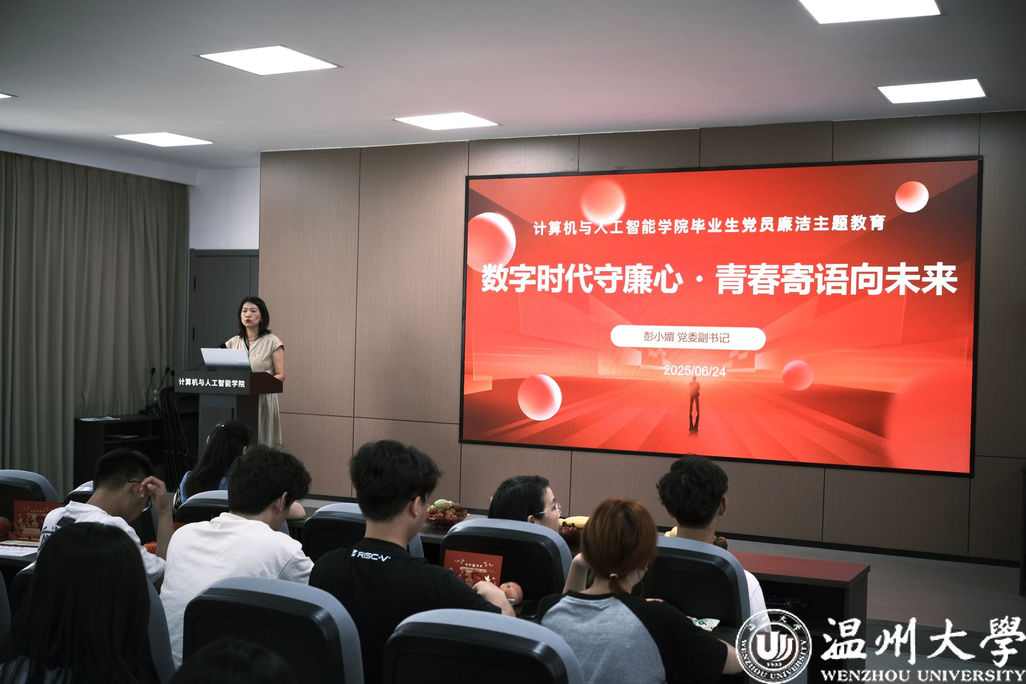 为助力毕业生党员在新征程上锚定方向、坚定信念,学院领导开展了专题教育活动。全力书记围绕党性教育主题,鼓励党员持续自我革新、强化责任担当,在未来的工作与生活中始终以高标准严格要求自己,争做时代先锋。彭小媚副书记则聚焦廉洁主题,深入阐述党性修养与纪律规矩的重要性,要求党员在投身技术创新浪潮时,严守道德与法律底线,永葆清正廉洁的政治本色。