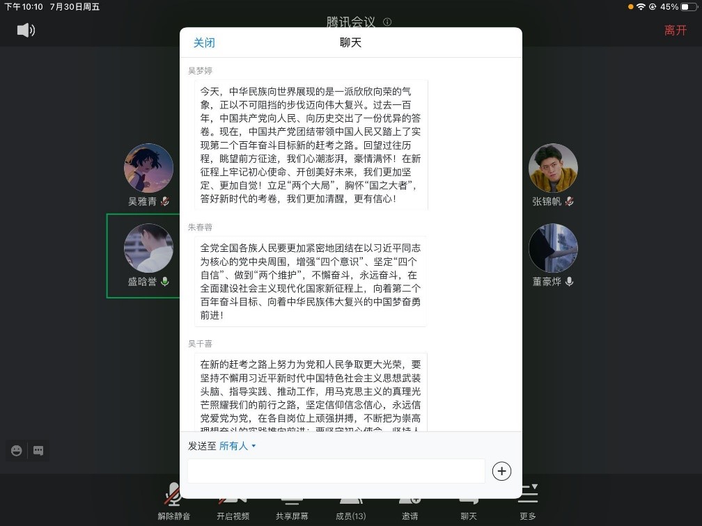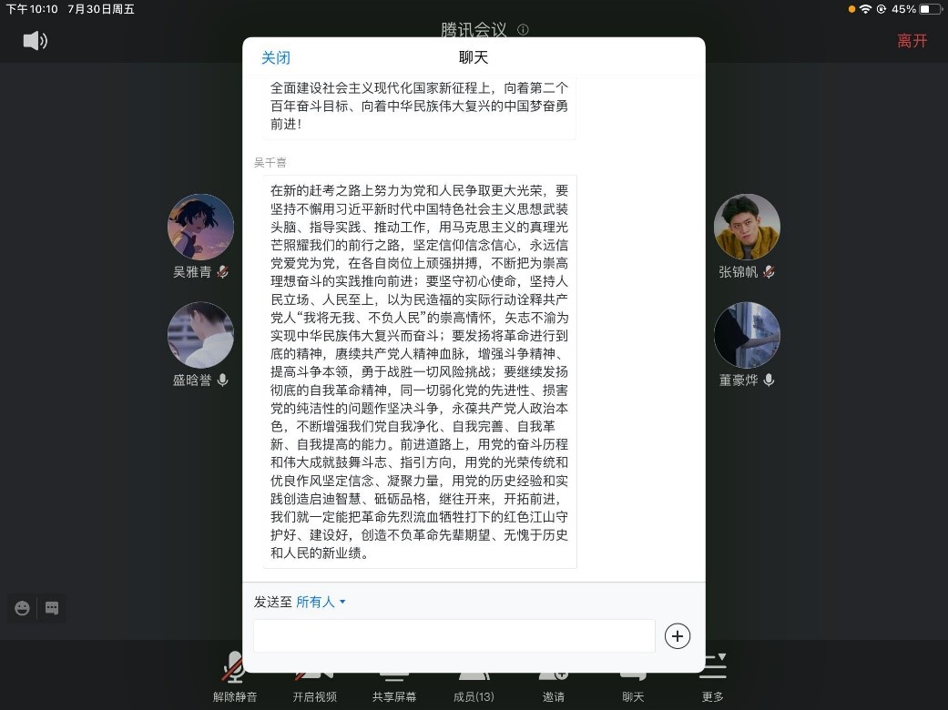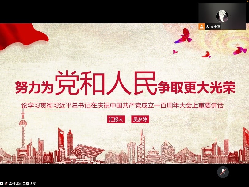 2021年7月1日,我们迎来了建党100周年华诞,习近平总书记在庆祝中国共产党成立100周年大会上发表了重要讲话,向世界宣示了坚持和发展中国特色社会主义的坚定决心。2021年7月30日晚,日本做爱 本科生第一党支部召开了由吴梦婷同学主持的学习会,学习习近平总书记此次重要讲话,共有4名正式党员和10名预备党员到会。
