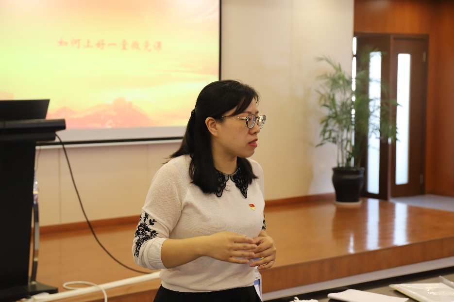 展示结束后,郑旭敏老师分别就六位同学的微党课提出相应的建议。郑旭敏老师指出微党课实质就是微课加党课,通过短时间内课程授课,以加强对党的宣传及教育。郑老师并就文案、PPT、讲述三大方面来全面论述如何上好一堂微党课。首先,文案需精细化,内容需点面结合,既要有广度,又要有深度;其次,PPT需简明明了,并具有视觉化;第三点是讲述,这对于演讲人的语音、语调、音准、语气、眼神、举止都有着较高的要求,特别是口头语言表达能力。在讲述过程中要求演讲人把握好情感和重点。