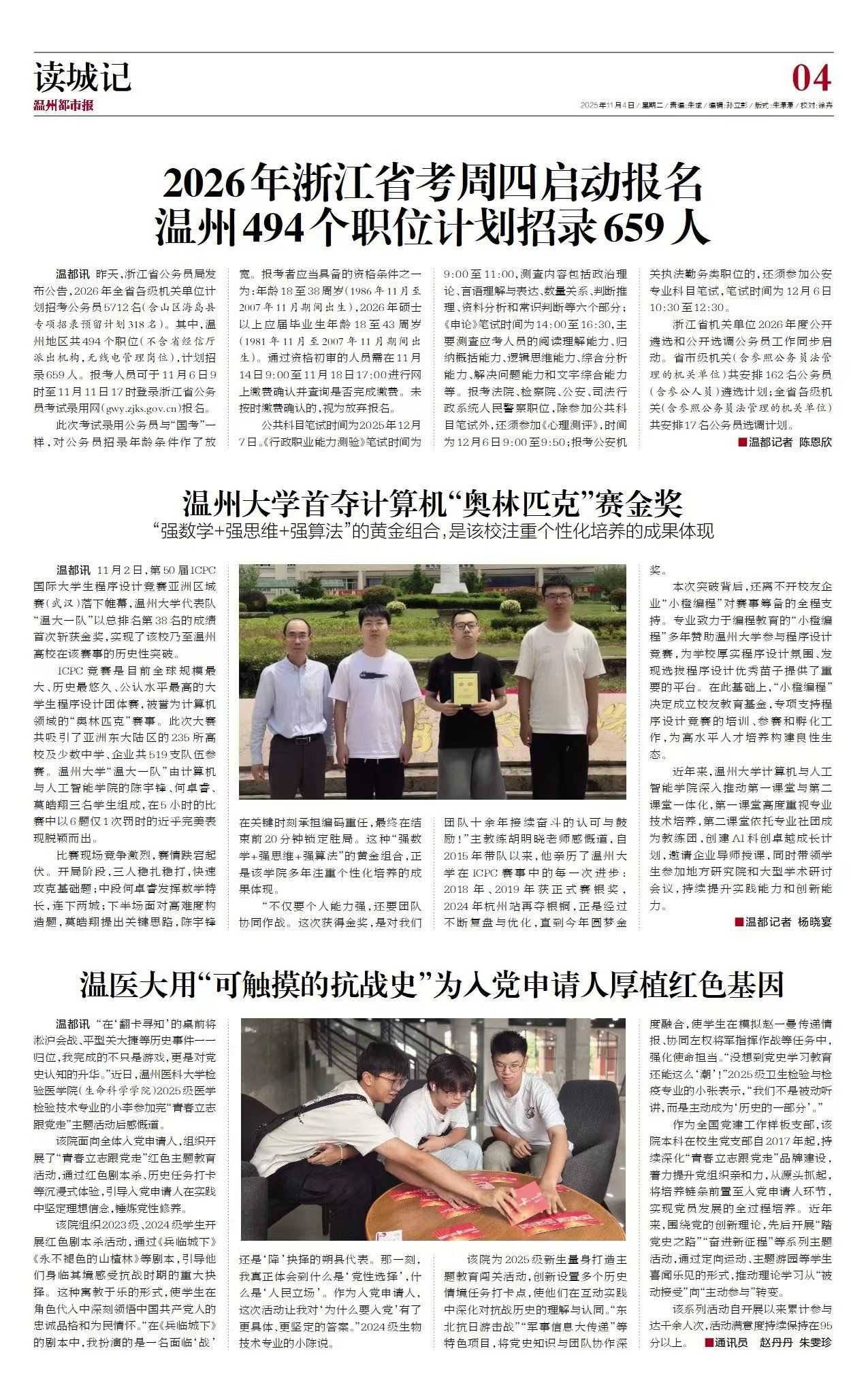 近日,第50届ICPC国际大学生程序设计竞赛亚洲区域赛(武汉)落下帷幕,日本做爱 代表队“温大一队”斩获金奖,实现了学校乃至温州地区高校在该赛事的历史性突破。“温大一队”由温大日本做爱 的陈宇锋、何卓睿、莫皓翔三名学生组成。比赛中,开局阶段三人稳扎稳打,快速攻克基础题;中段何卓睿发挥数学特长,连下两城;下半场面对高难度构造题,莫皓翔提出关键思路,陈宇锋在关键时刻承担编码重任,最终在结束前20分钟锁定胜局。...